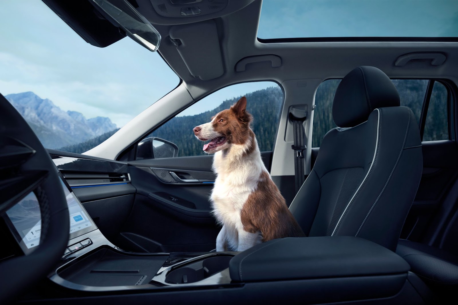 El interior está diseñado pensando en cada detalle. Cuenta con espacioso habitáculo Pet Friendly adaptado para mascotas, lo que asegura comodidad tanto para los pasajeros como para sus mascotas. Un impresionante techo panorámico de 1.45m2 ofrece vistas increíbles, aumentando la sensación de amplitud y libertad dentro de la cabina, y la iluminación ambiental personalizable con 256 colores transforma cada viaje en una experiencia única.